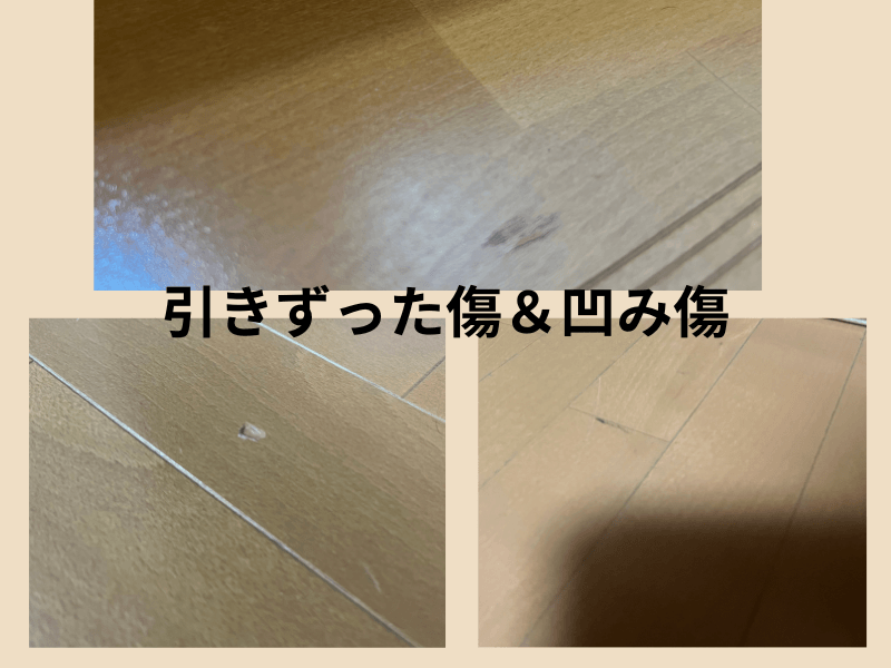 傷の原因は主に3つ。犬の爪と椅子・ソファの脚、掃除機で硬いものを引きずりできたものです。